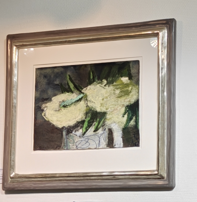 Auf Bütten ca. 15×21 cm. Mit Blattgoldrahmen (übereck verarbeitet-handvergoldet-Weißgold) ca. 40×47 cm