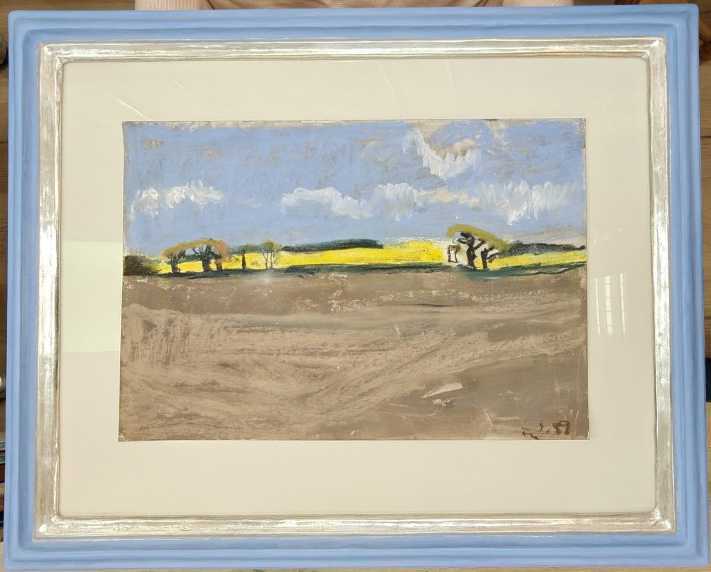 Kreide- handsigniert, datiert (19)97. Rückseitig ebenfalls handsigniert, betitelt „Gelting“ – Rapsfelder und datiert.